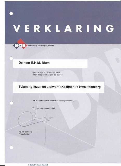 Door de jaren heen heb ik bij diverse grotere bouwbedrijven gewerkt, als timmerman en later als voorman. Naast het volgen van allerlei vaktechnische opleidingen heb ik mij ook ontwikkeld op het gebied van Bedrijfshulpverlening en Veiligheid. (Link naar certificaten)